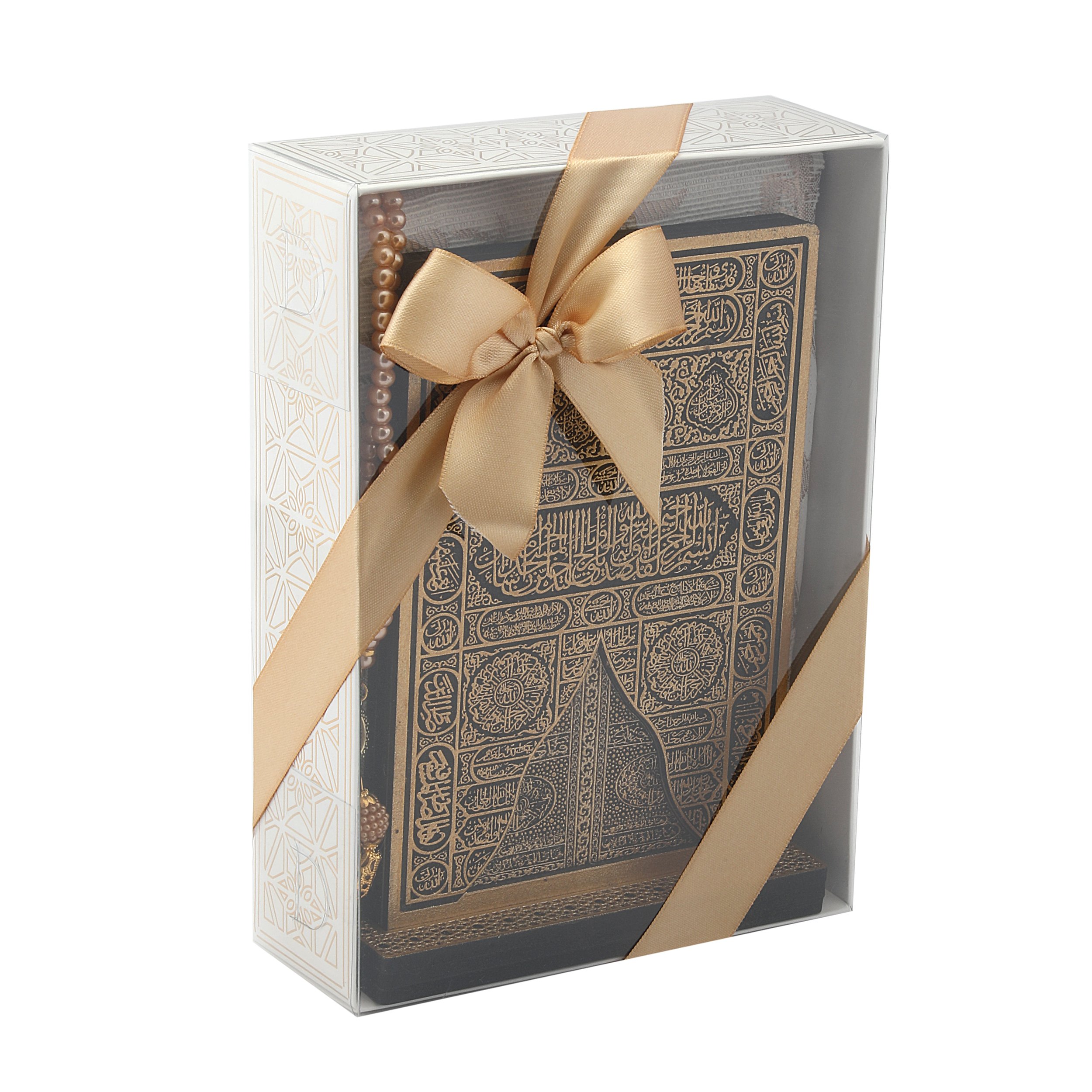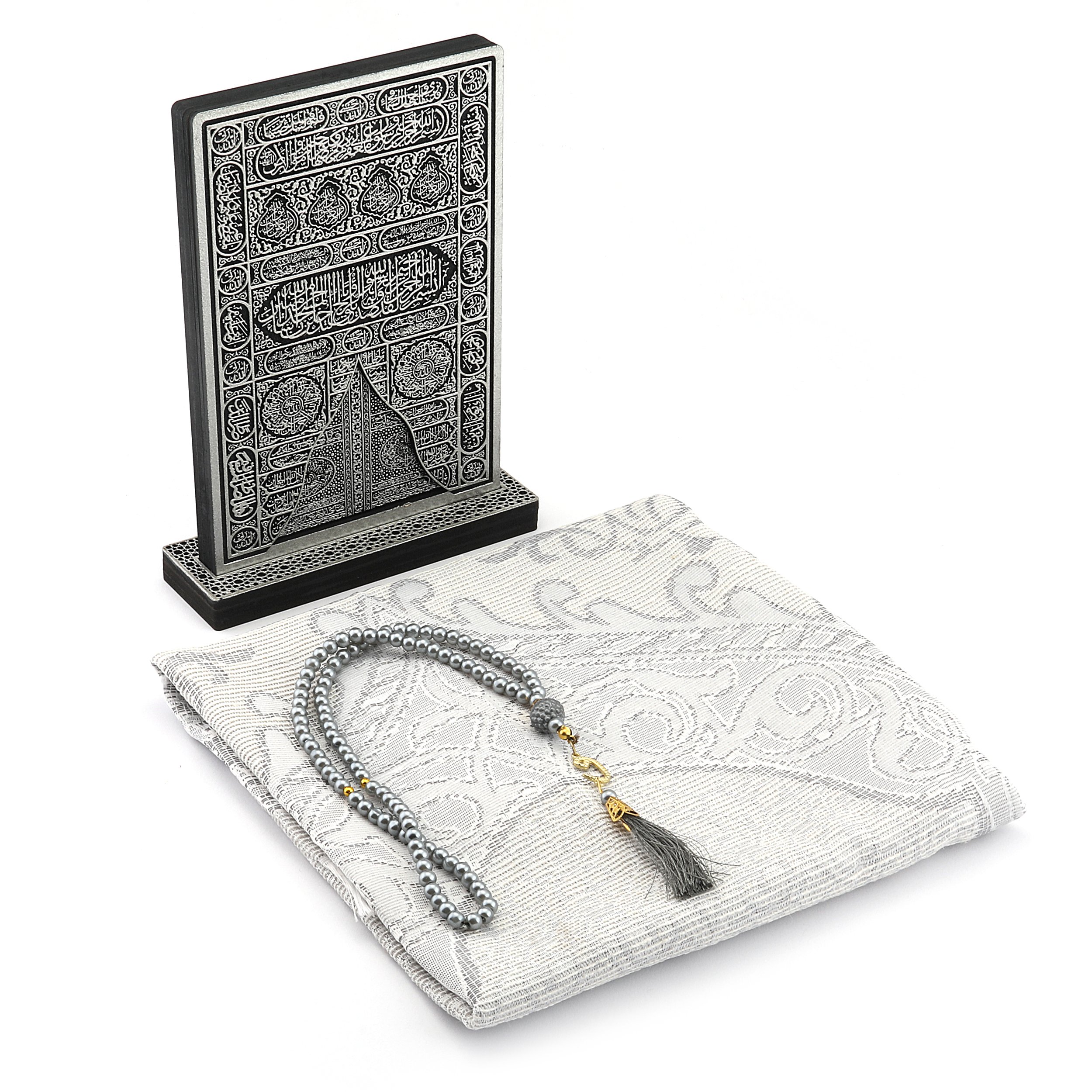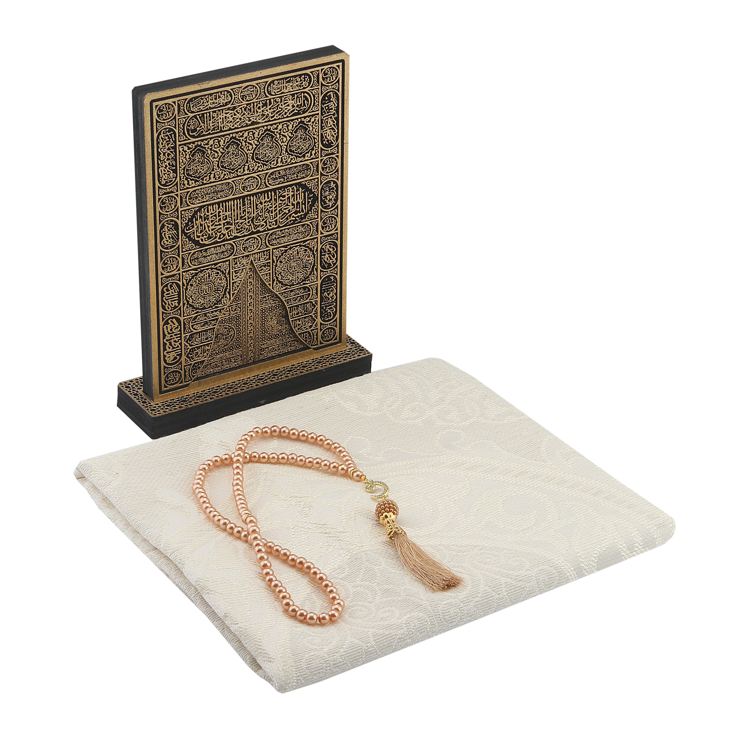 - Asetat kutu içerisinde 70x110 Cm Tafta Seccade, 99'luk 6 Mm Vavlı İnci Tesbih, 22 Cm Ahşap Kabe Kapısı Biblo ile beraber sunulur.