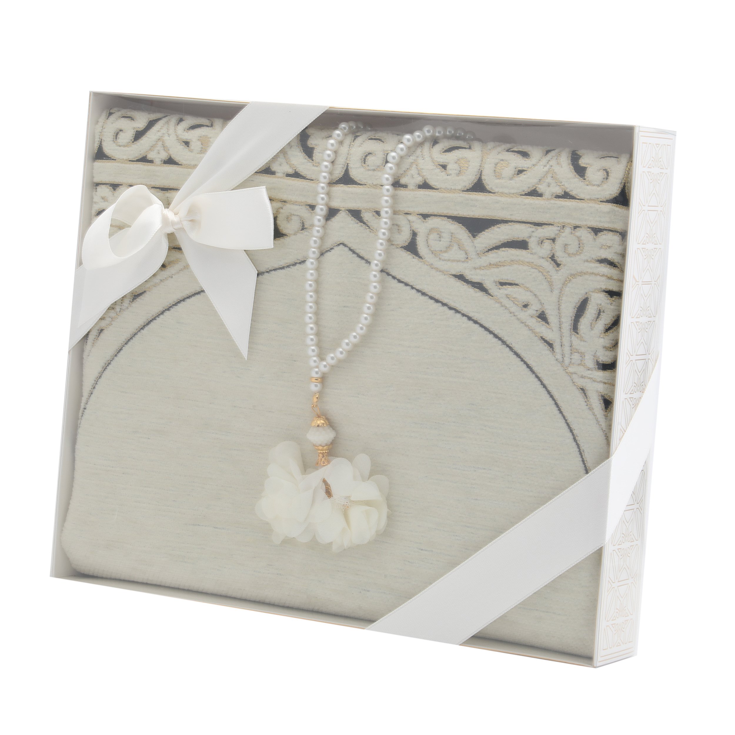 - Asetat kutu içerisinde 70x115 Cm Şönil Seccade ve 99'luk 6 mm Tül Güllü İnci Tesbih ile beraber sunulur.