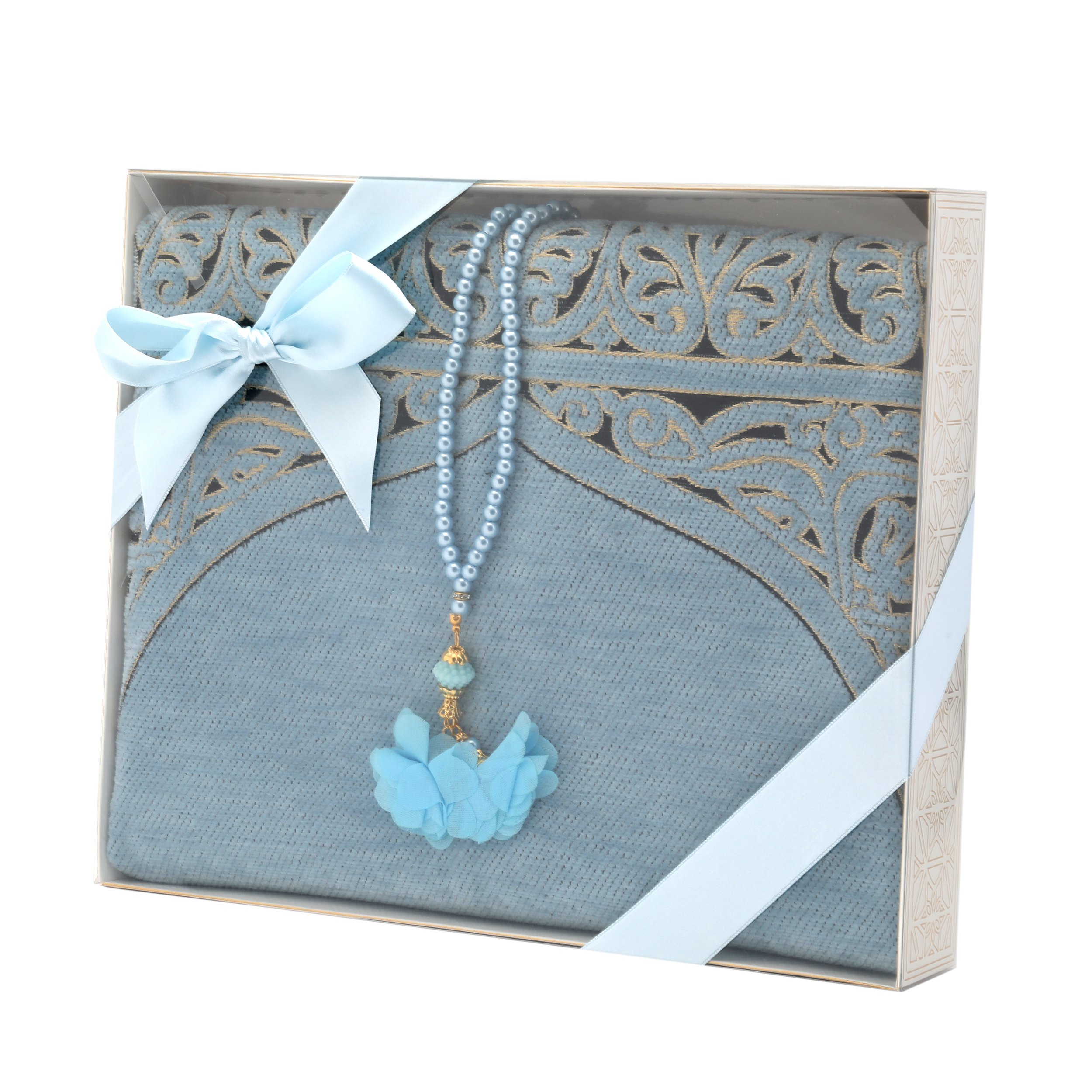 - Asetat kutu içerisinde 70x115 Cm Şönil Seccade ve 99'luk 6 mm Tül Güllü İnci Tesbih ile beraber sunulur.