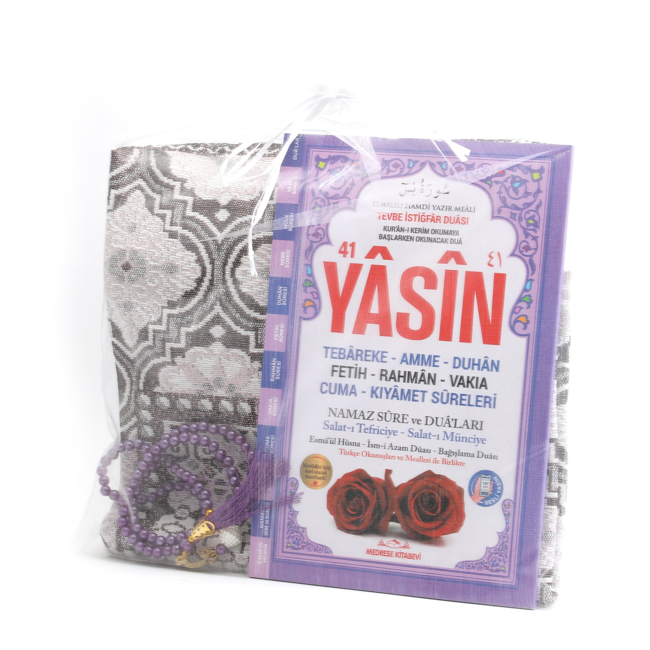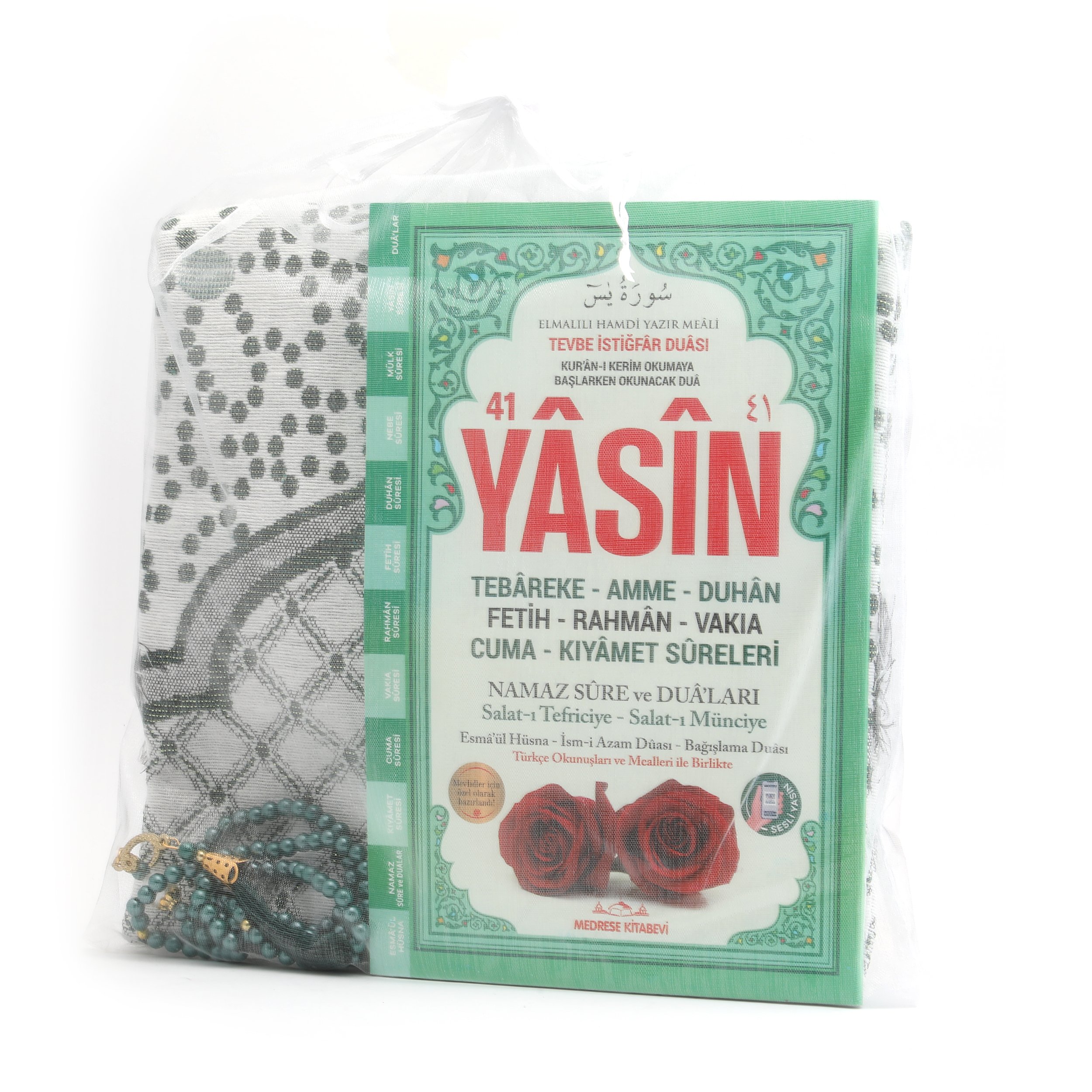 - Tül Kese içerisinde 70x110 Cm Simli Tafta Seccade, 17x25 Cm 192 Sayfa Orta Boy Arapça/Türkçe Yasin Ve 99'luk 6 mm Vavlı İnci Tesbih ile beraber sunulur.