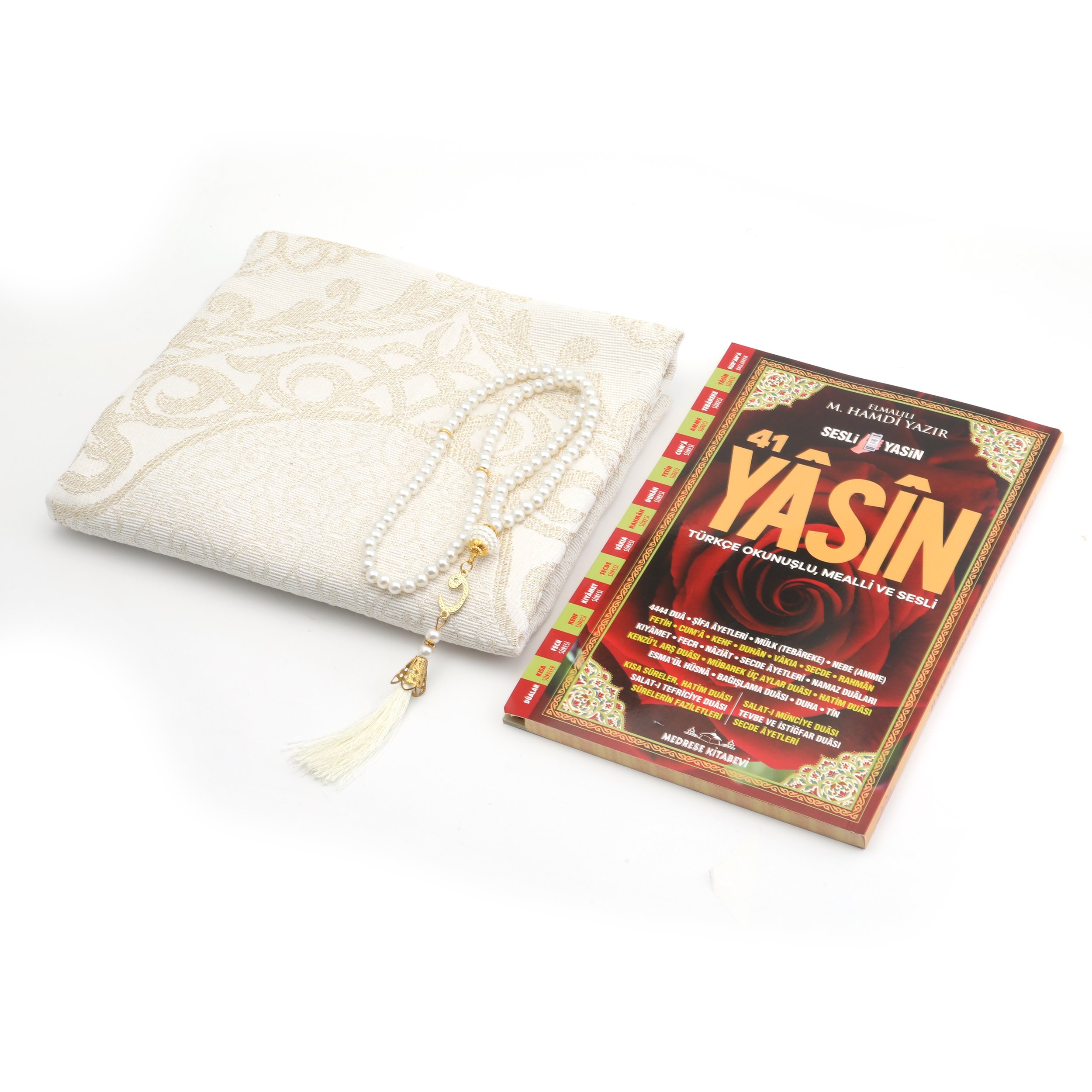 - Tül Kese içerisinde 70x110 Cm Simli Tafta Seccade, 17x25 Cm 192 Sayfa Orta Boy Arapça/Türkçe Yasin Ve 99'luk 6 mm Vavlı İnci Tesbih ile beraber sunulur.