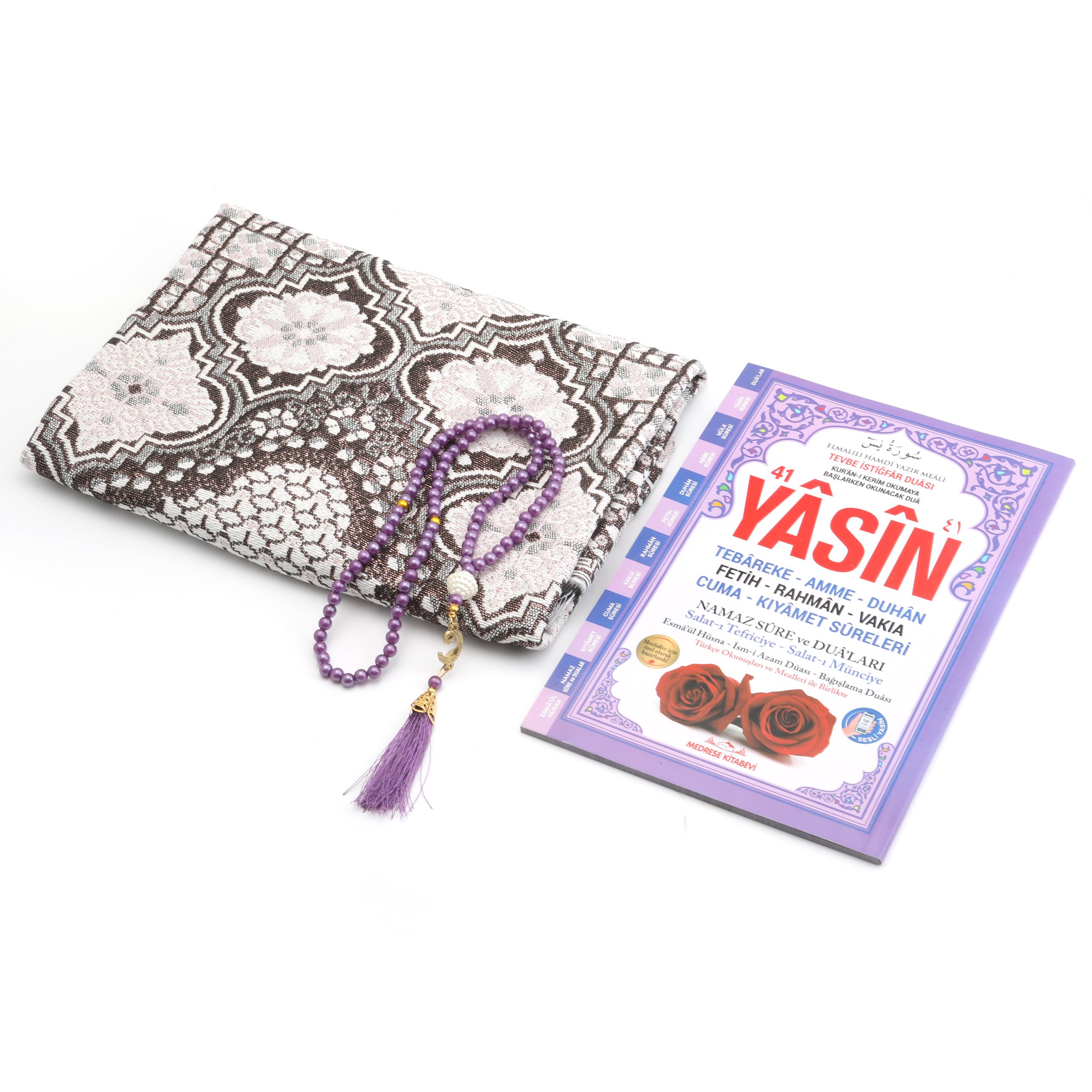 - Tül Kese içerisinde 70x110 Cm Simli Tafta Seccade, 17x25 Cm 192 Sayfa Orta Boy Arapça/Türkçe Yasin Ve 99'luk 6 mm Vavlı İnci Tesbih ile beraber sunulur.