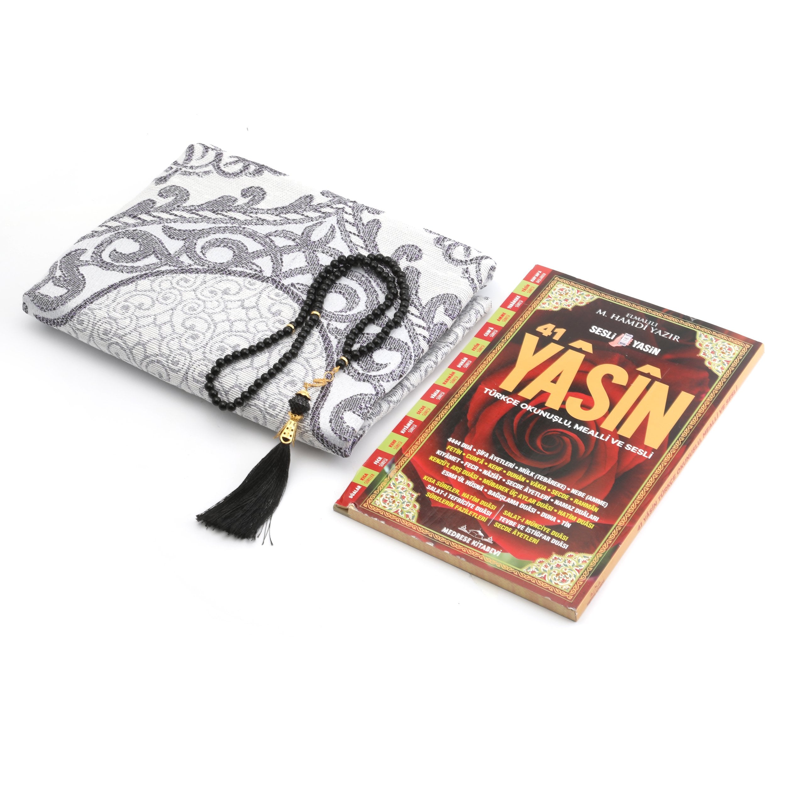 - Tül Kese içerisinde 70x110 Cm Simli Tafta Seccade, 17x25 Cm 192 Sayfa Orta Boy Arapça/Türkçe Yasin Ve 99'luk 6 mm Vavlı İnci Tesbih ile beraber sunulur.