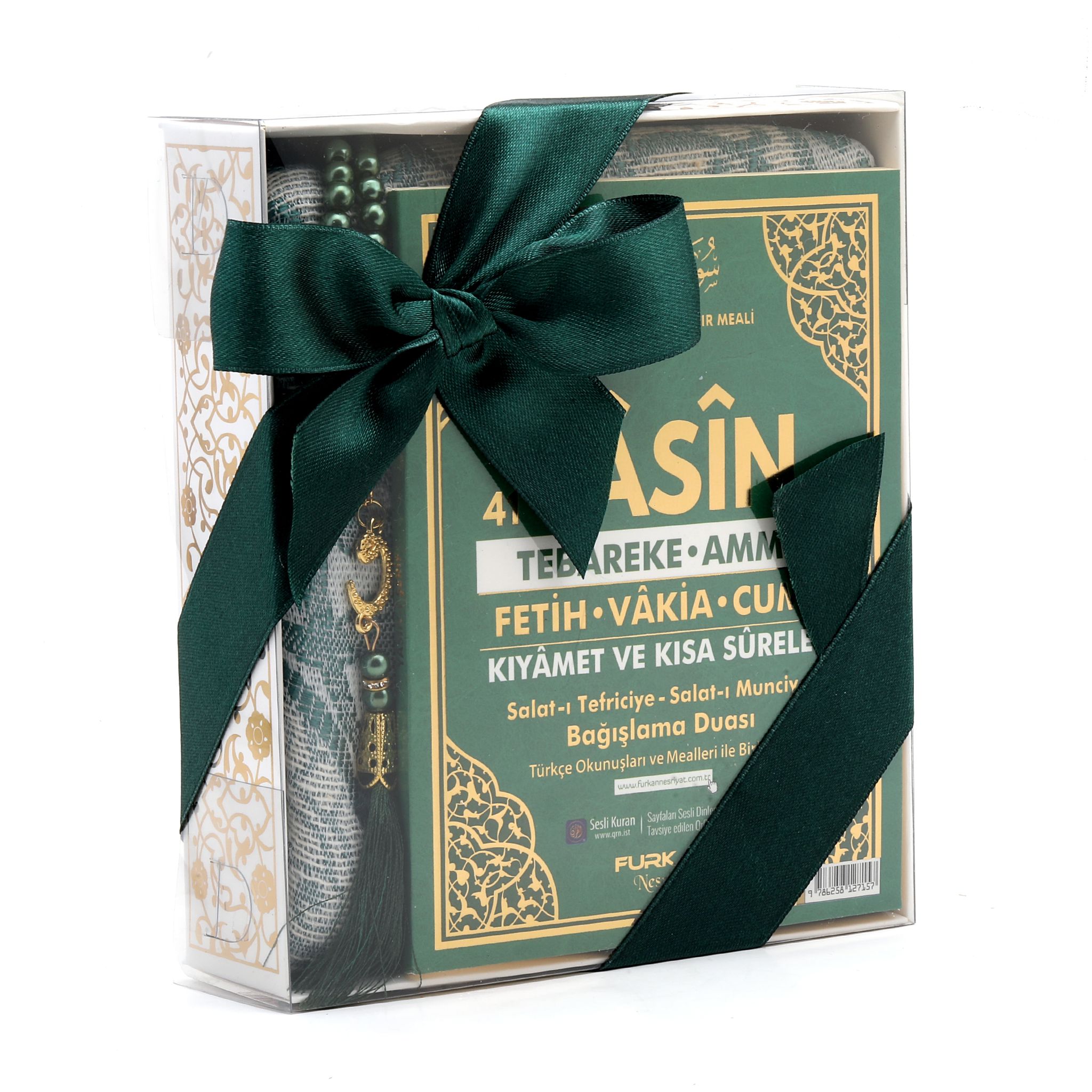 - Asetat kutu içerisinde 99'luk 6 mm Vavlı İnci Tesbih, 120 gr 70x110 Tafta Seccade ve 13x17 cm 128 Sayfa Çanta Boy Renkli Model Arapça/Türkçe Yasin Kitabı ile beraber sunulur.