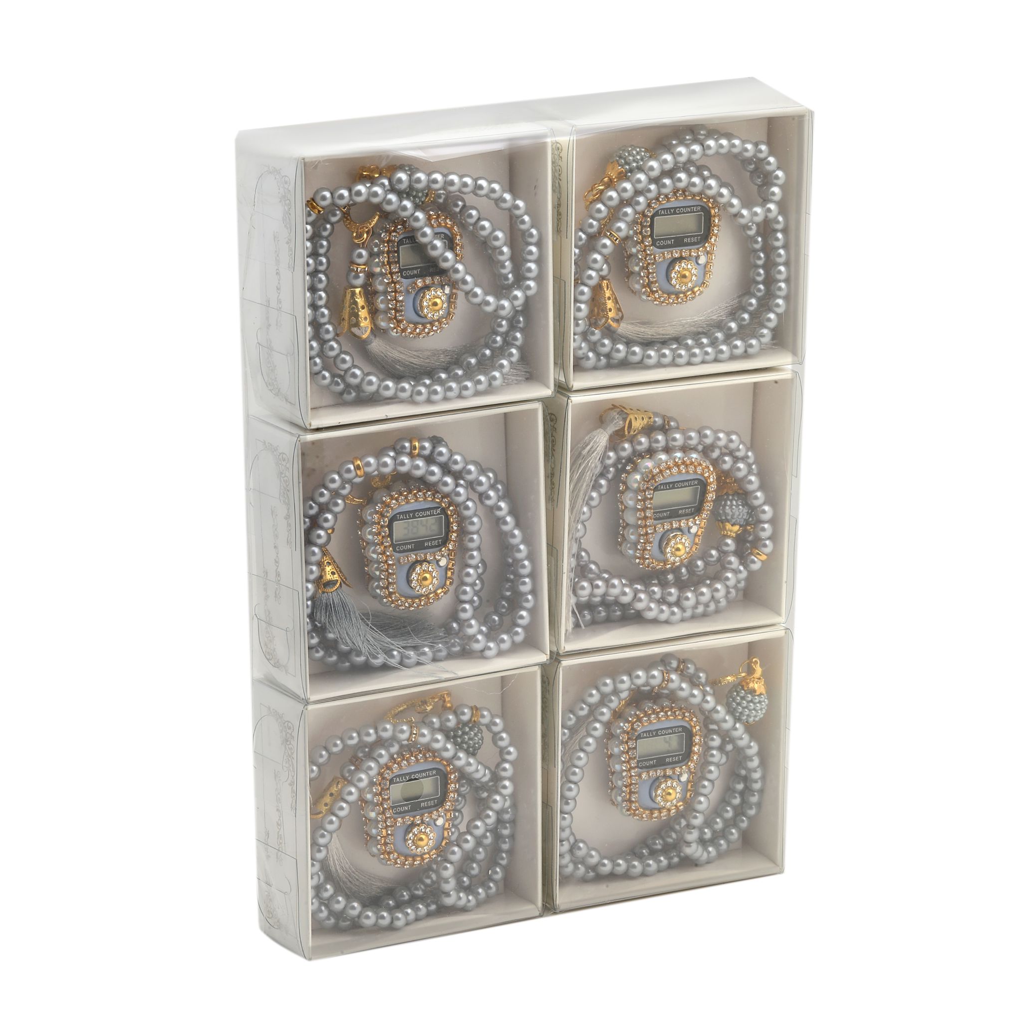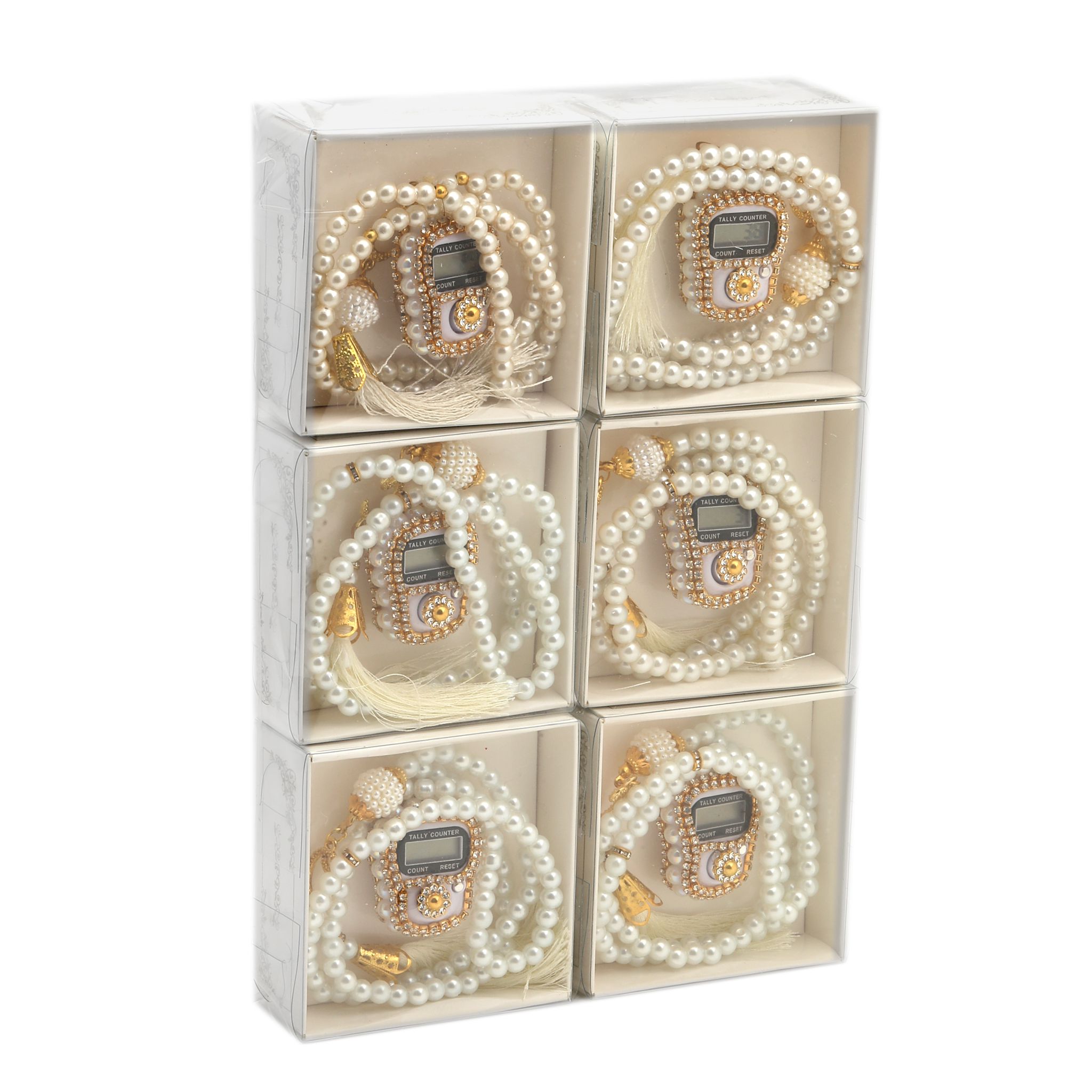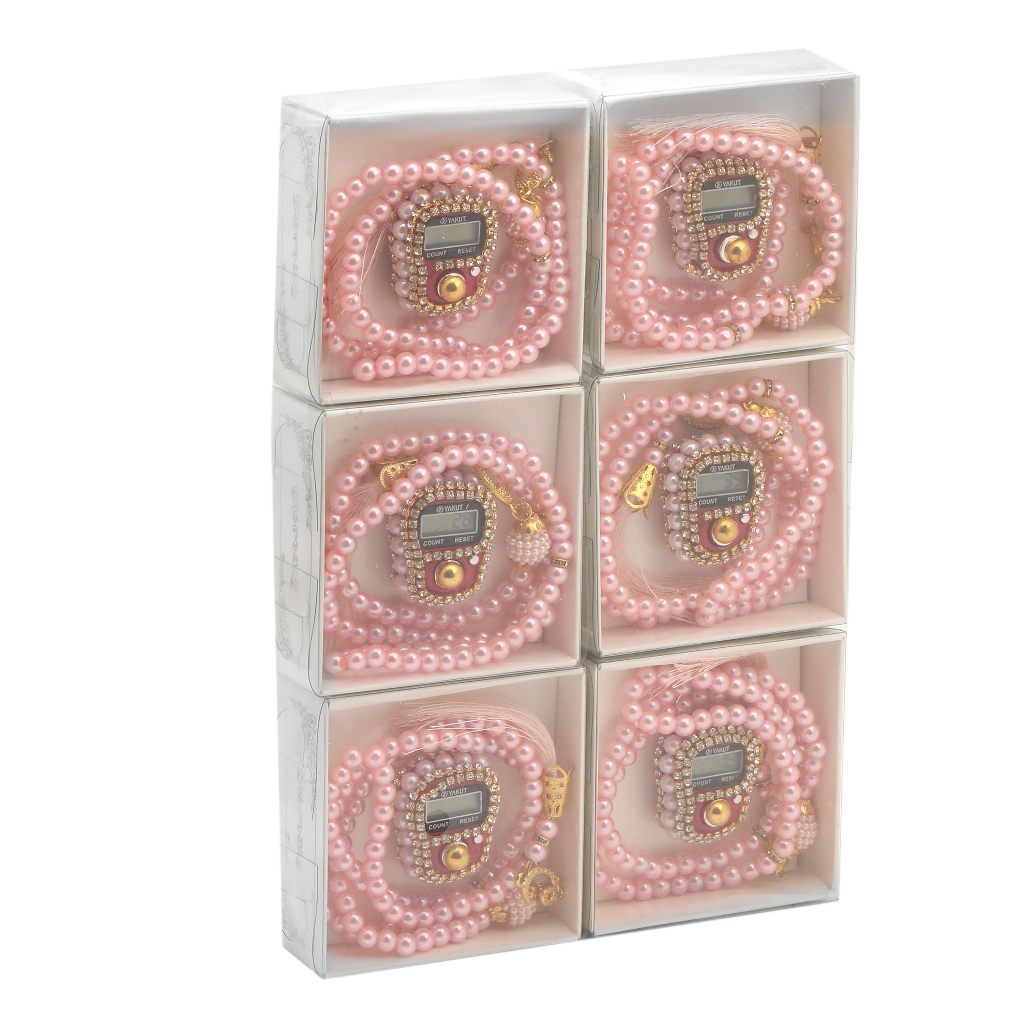 - Asetat kutu içerisinde taşlı zikirmatik ve 99'luk 6 mm vavlı inci tesbih