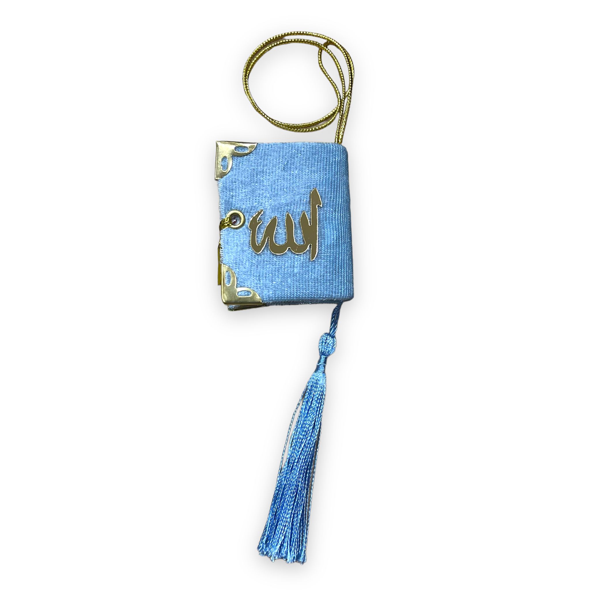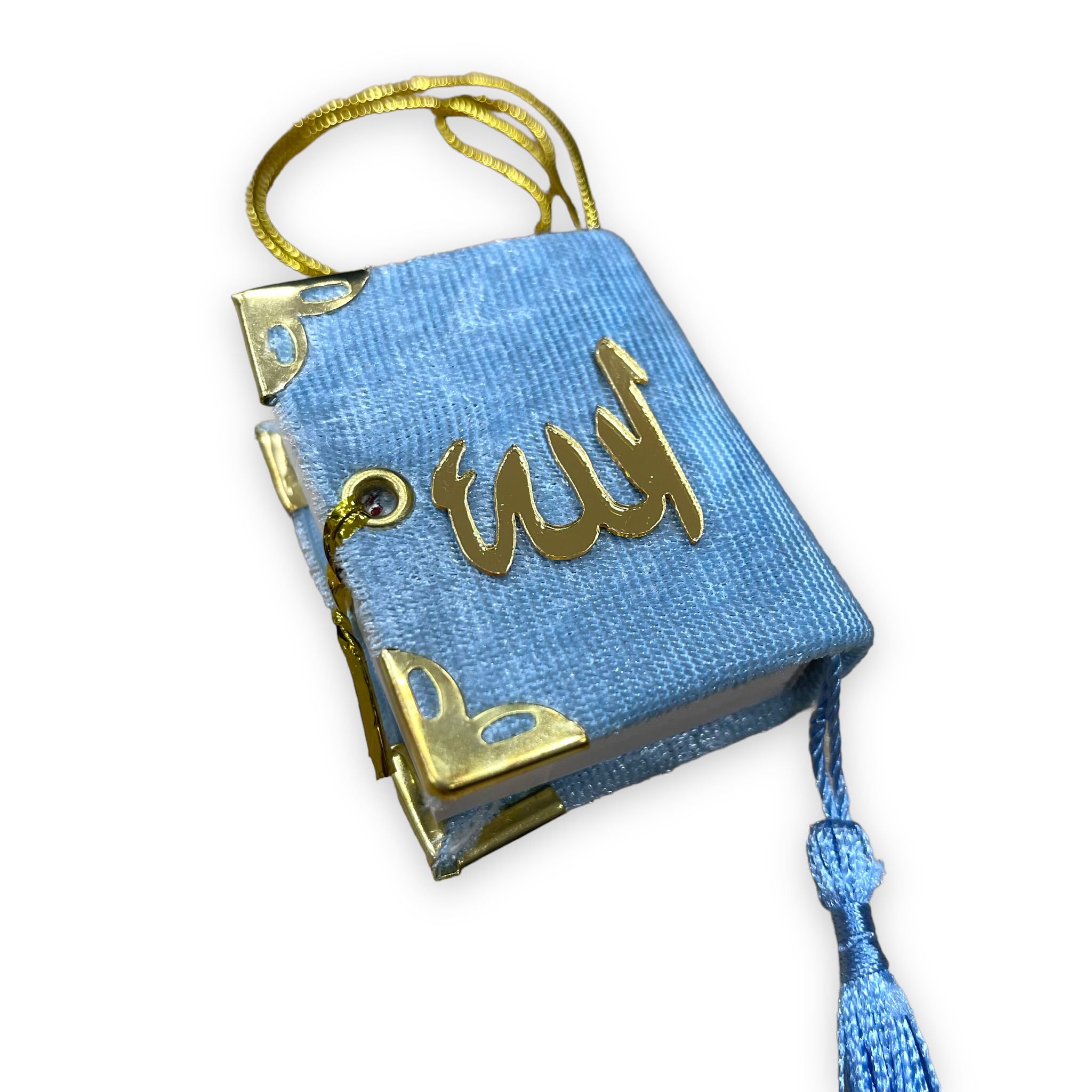 - Ön tarafına Allah lafızı yapıştırılmış olup kadife ile kaplanmıştır. İçindeki mini Kuran-ı Kerim'in 5x6 cm ölçüsündedir.