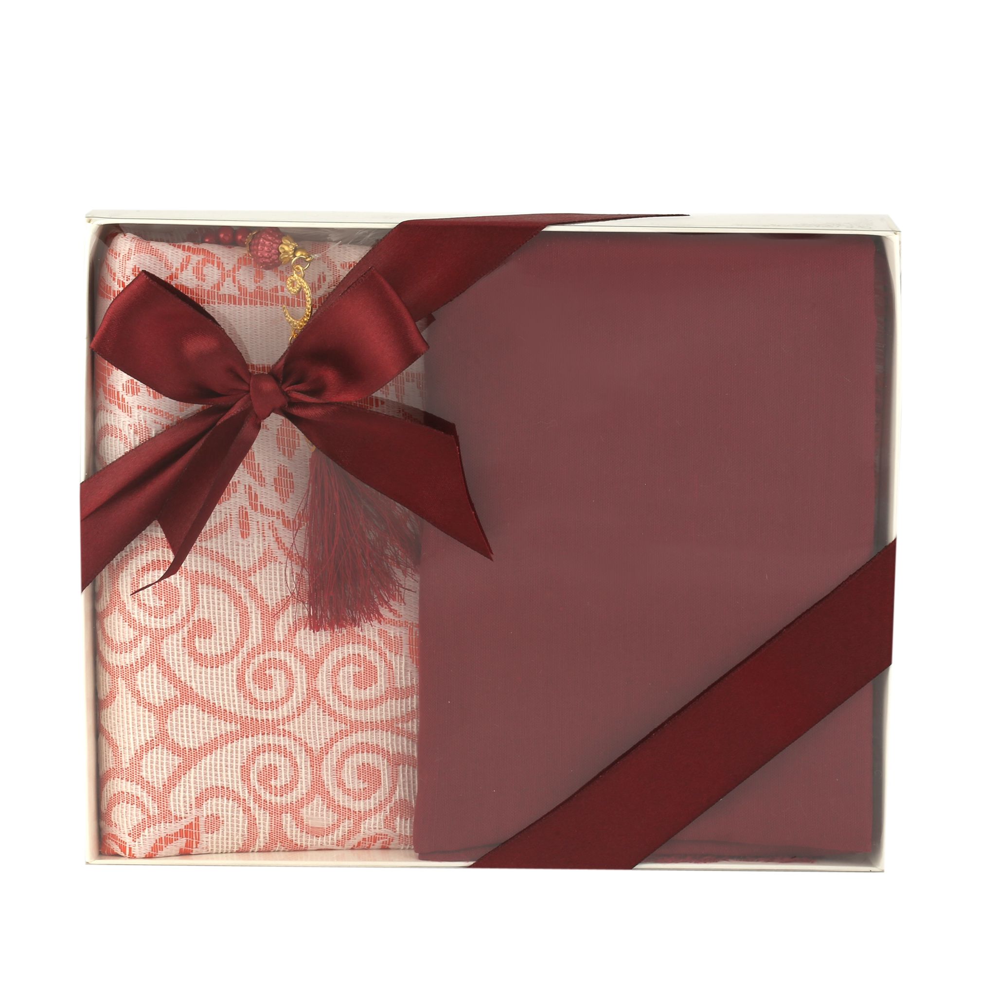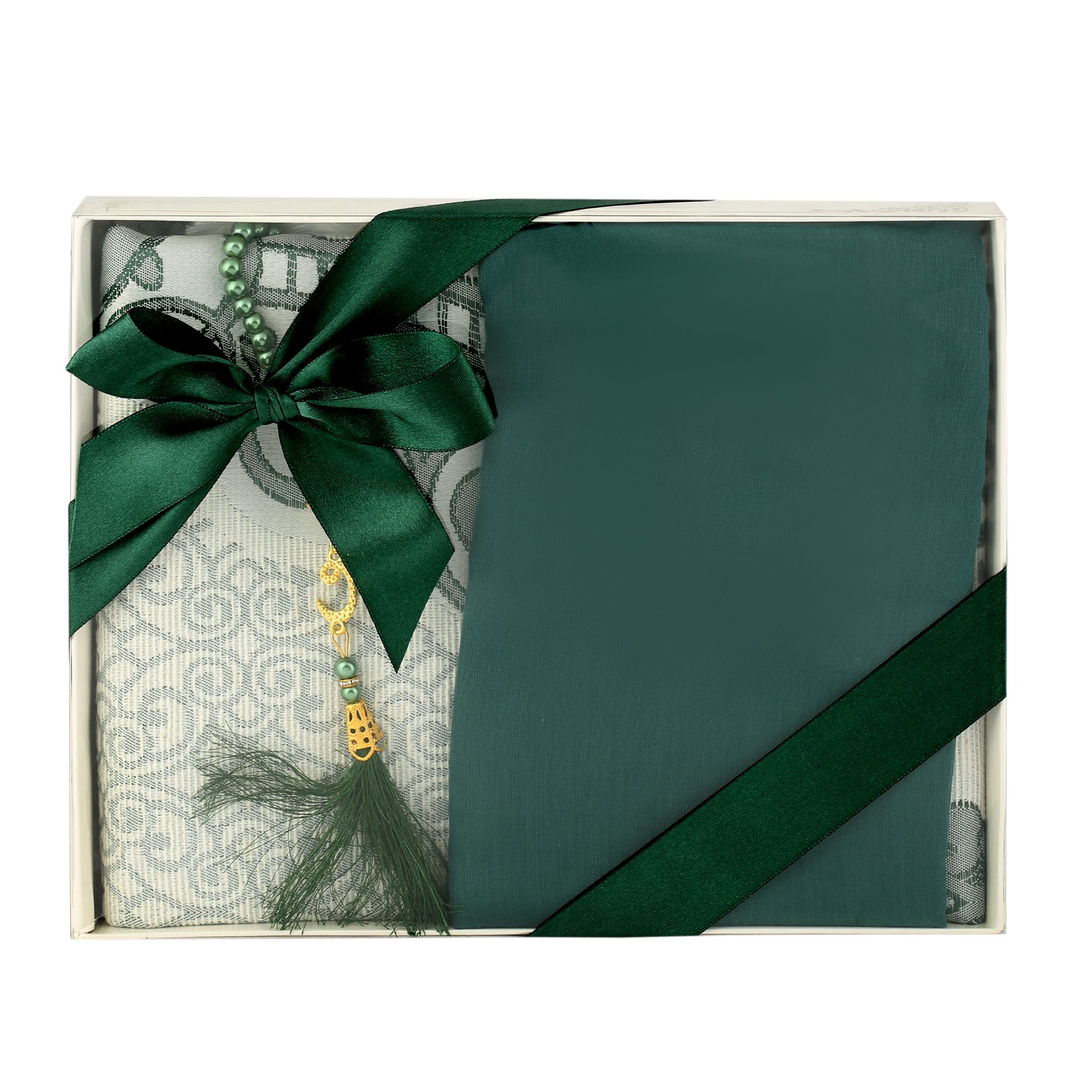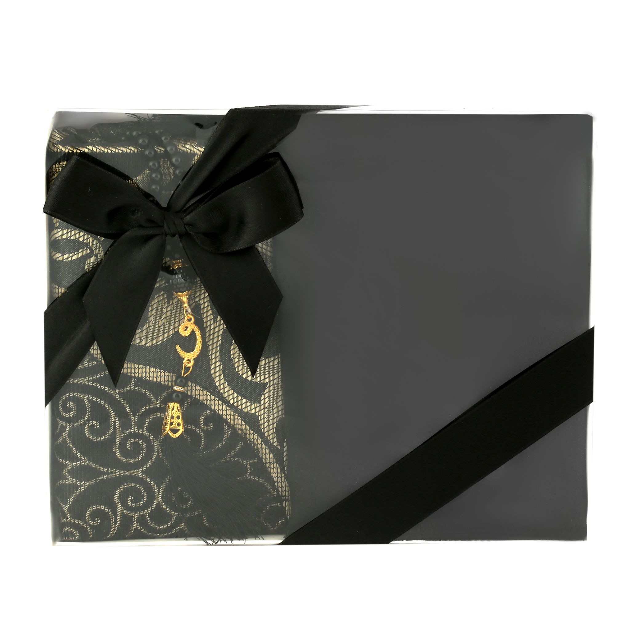 - Asetat kutu içerisinde 200 gr '70x110' Pamuk Tafta Seccade, 100 cm Düz Saçaklı Renkli Pamuk Eşarp ve 99'luk Vavlı İnci Tesbih ile beraber sunulur.
