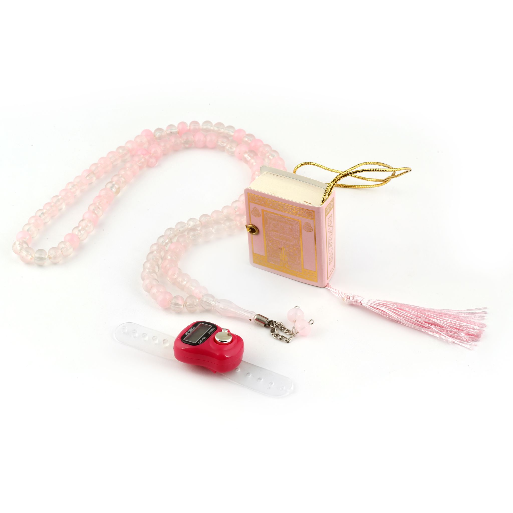 - Asetat kutu içerisinde 99'luk 10 mm Zincirli Tesbih, Yüzük Zikirmatik ve Ofset Yaldızlı Tam Kuran-ı Kerim Mini Oto Süs ile beraber sunulur.