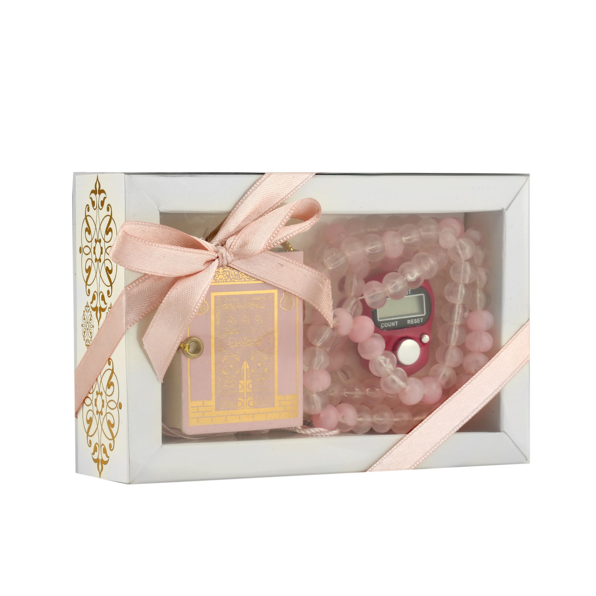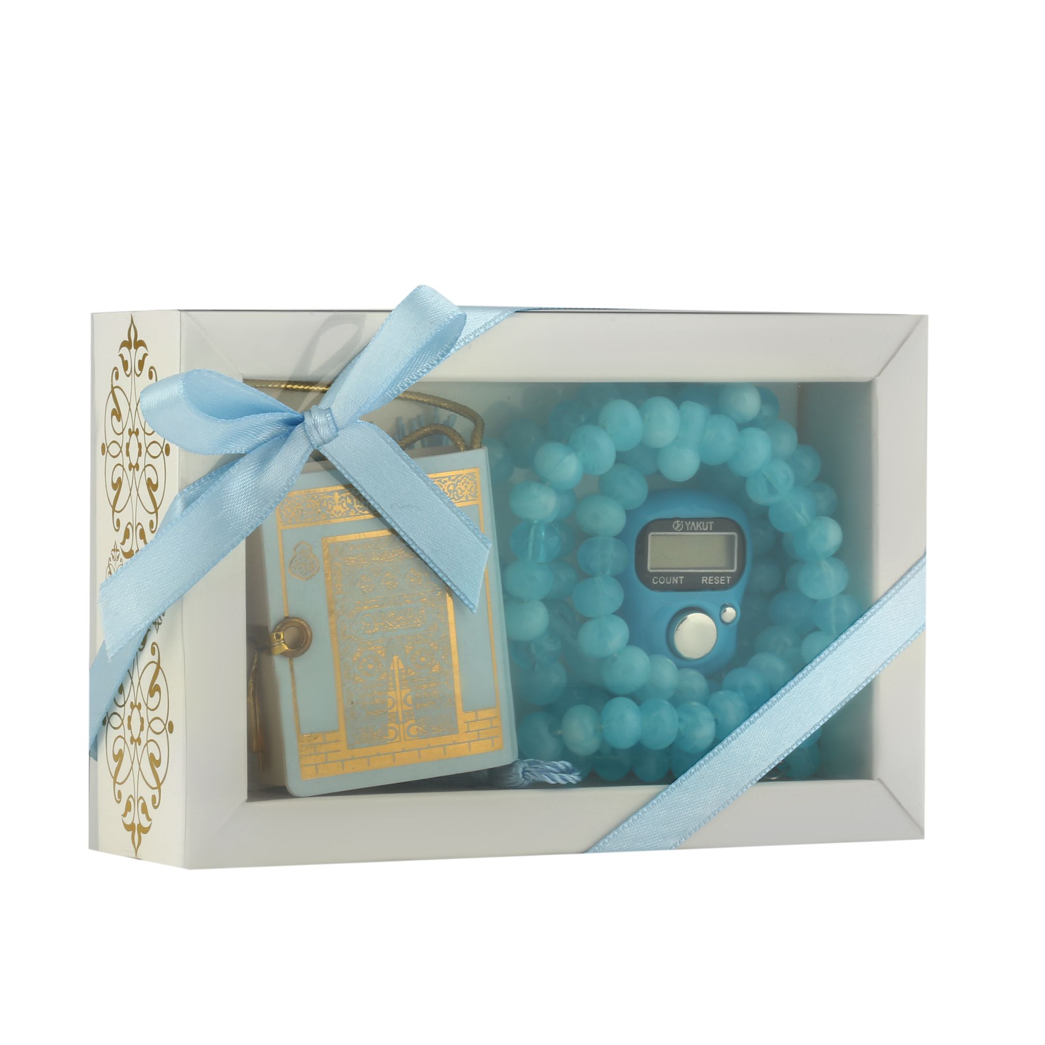- Asetat kutu içerisinde 99'luk 10 mm Zincirli Tesbih, Yüzük Zikirmatik ve Ofset Yaldızlı Tam Kuran-ı Kerim Mini Oto Süs ile beraber sunulur.