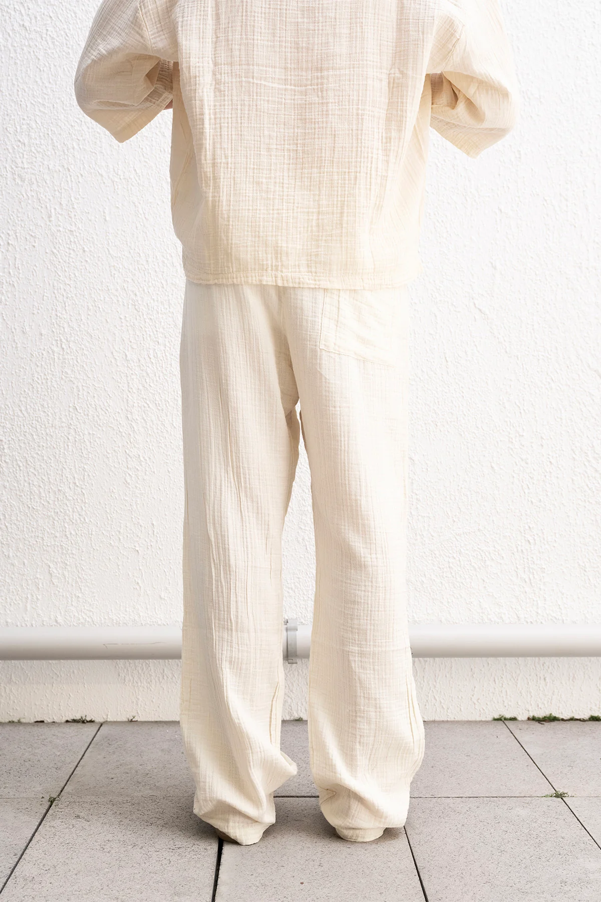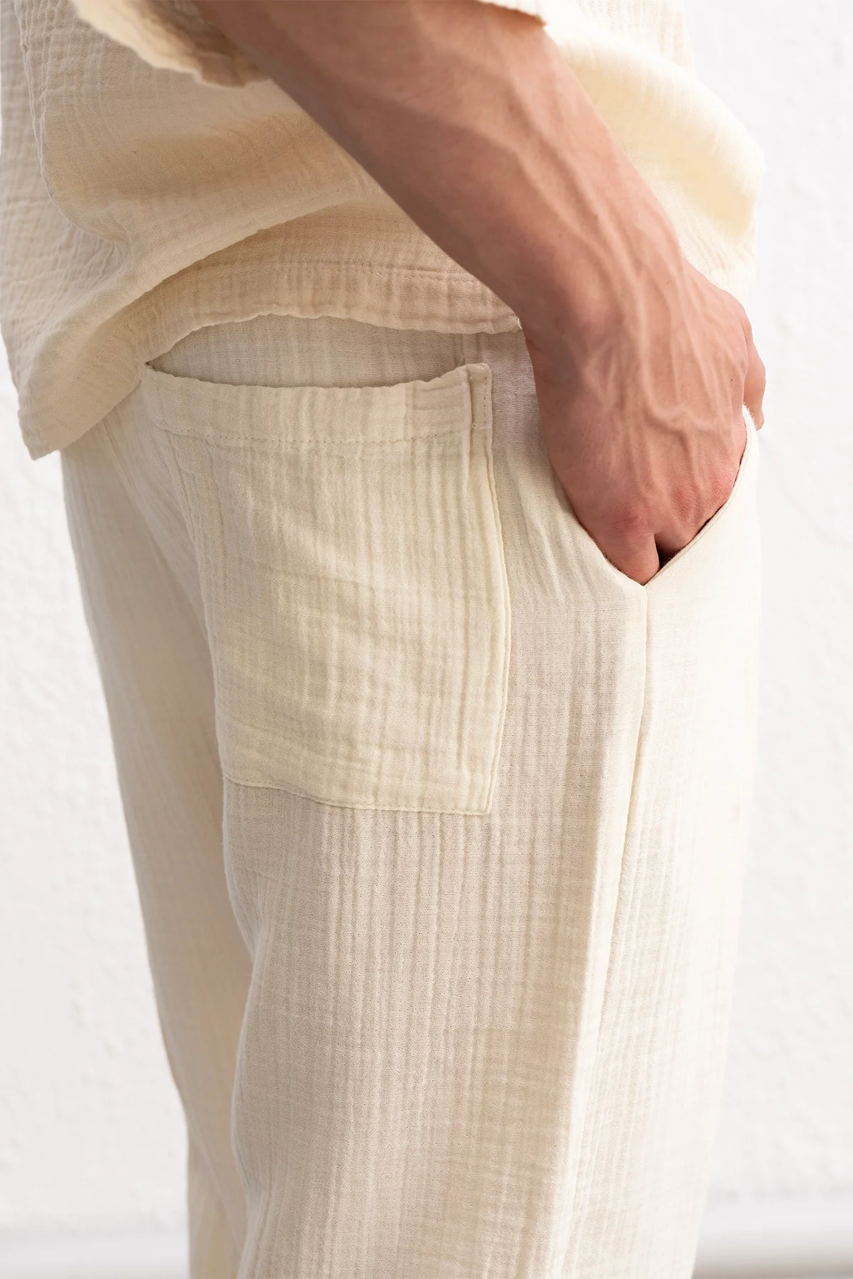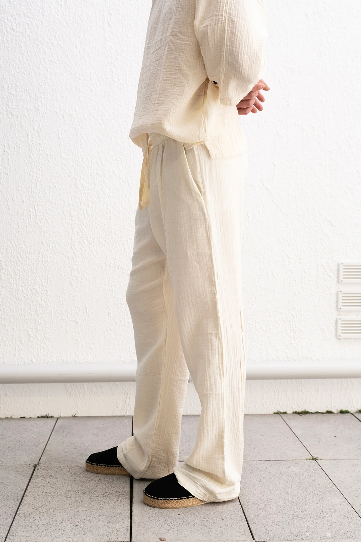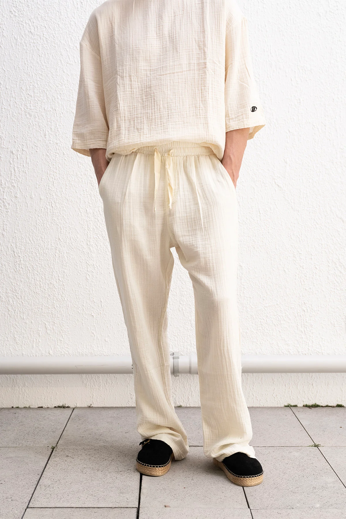Relaxed fit, dökümlü, beli bağcık detaylı pantolon, rahatlık ve şıklığı birleştiren zarif bir tasarımdır. Dökümlü yapısı, pantolona modern ve rahat bir görünüm kazandırırken, relaxed fit kesimi gün boyu konforlu bir kullanım sağlar. Beli bağcık detayları, esneklik ve uyum sunarak rahatlık sağlar. %100 pamuk içeriği ile doğal, nefes alabilir ve yumuşak bir kumaş sunar, günlük kullanım için mükemmel bir seçenek.