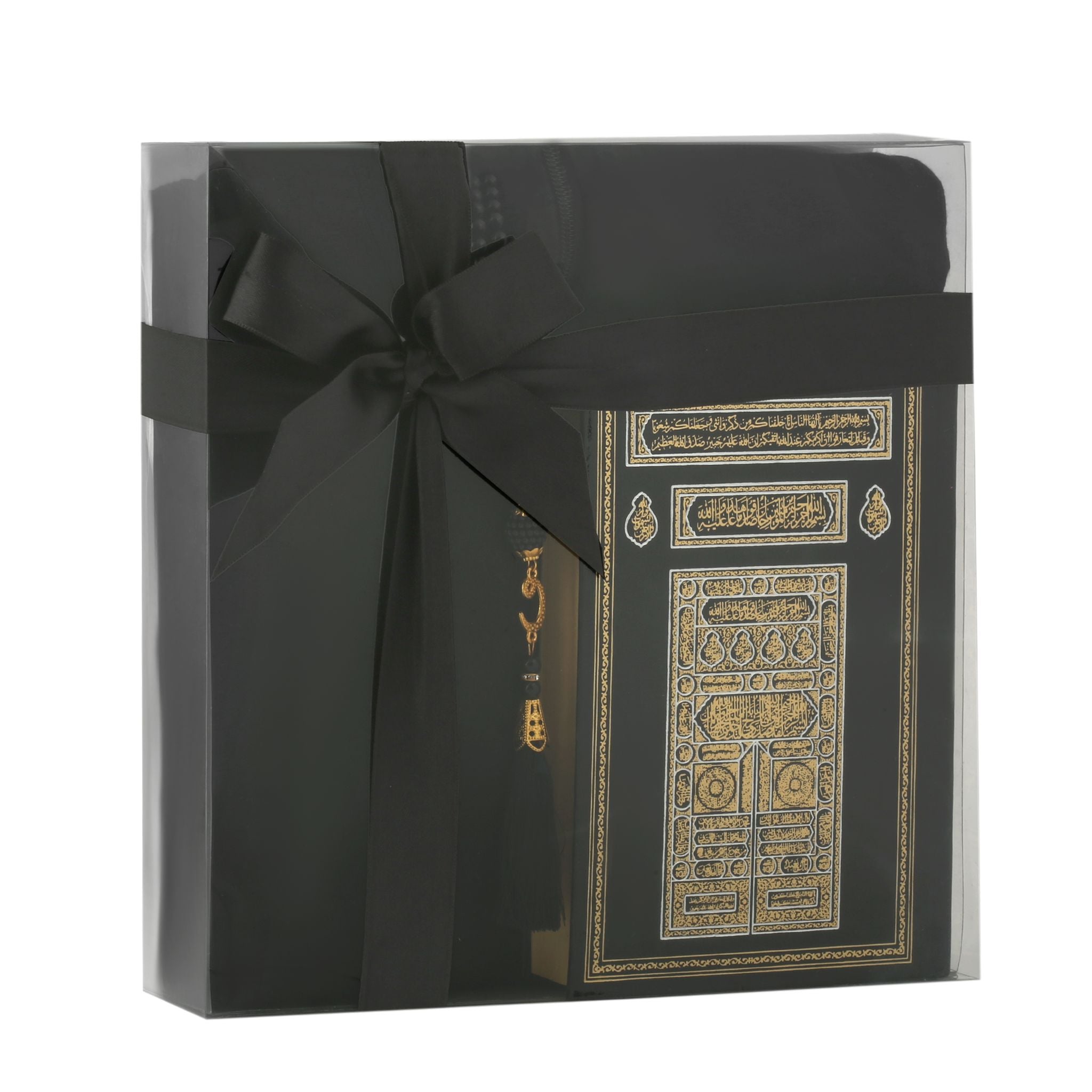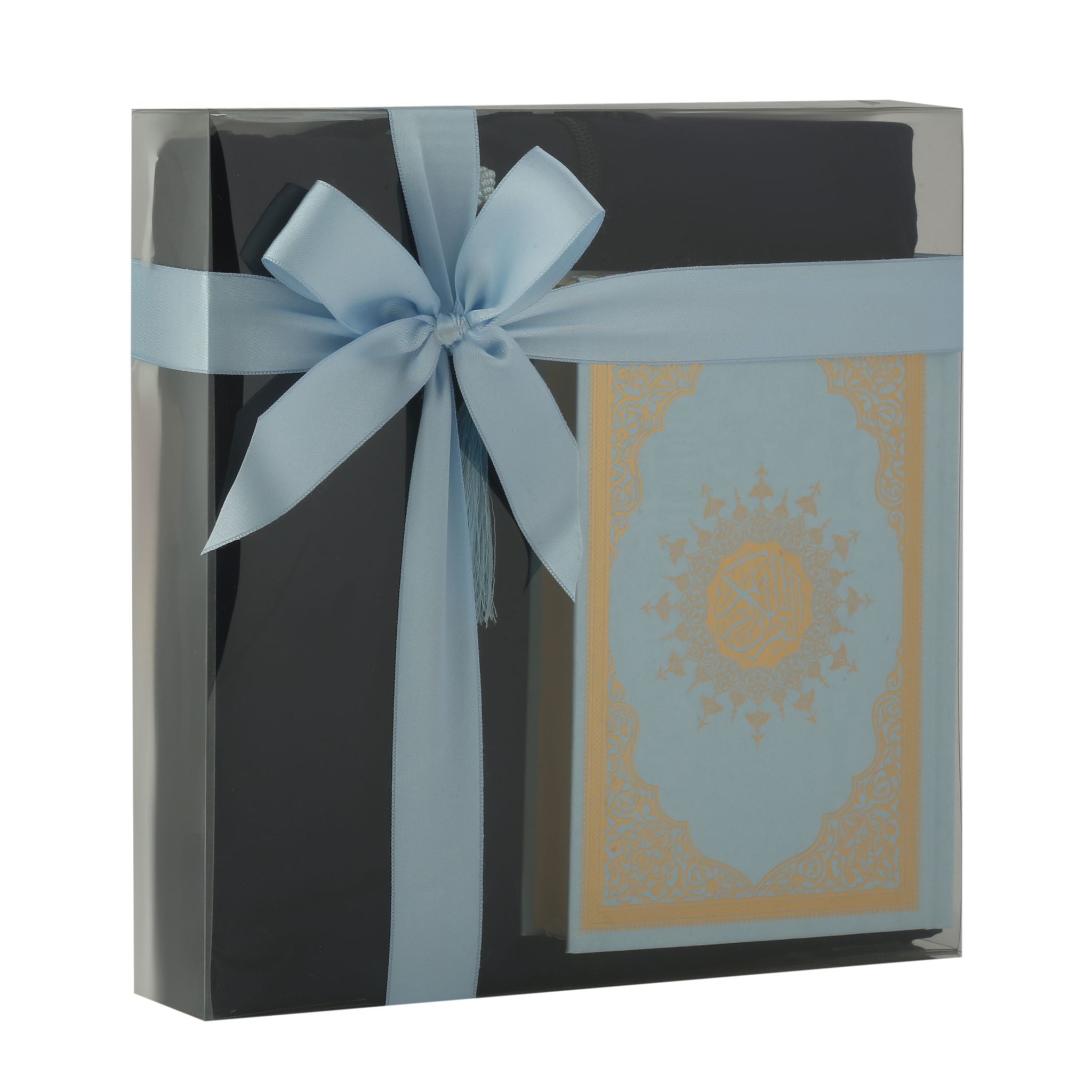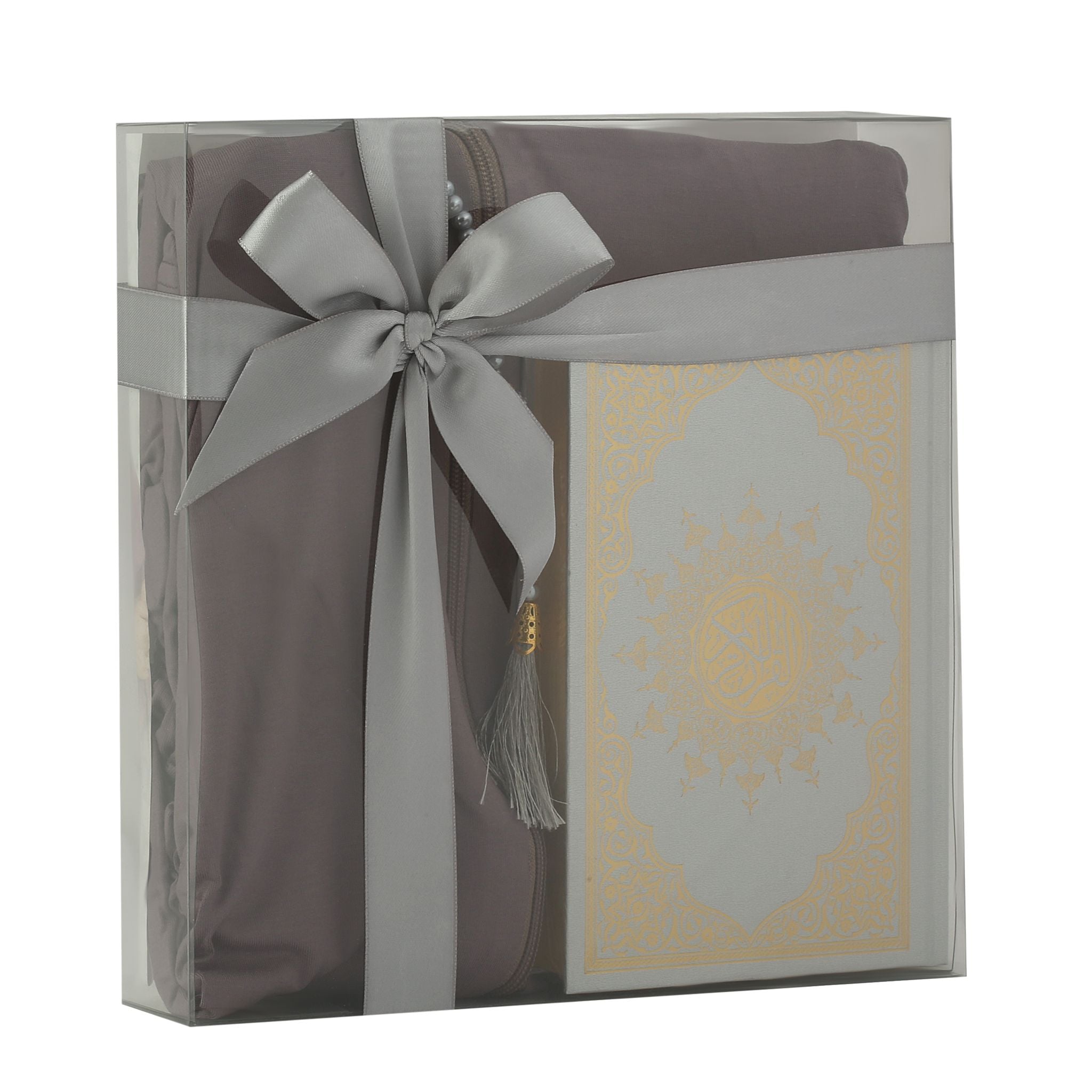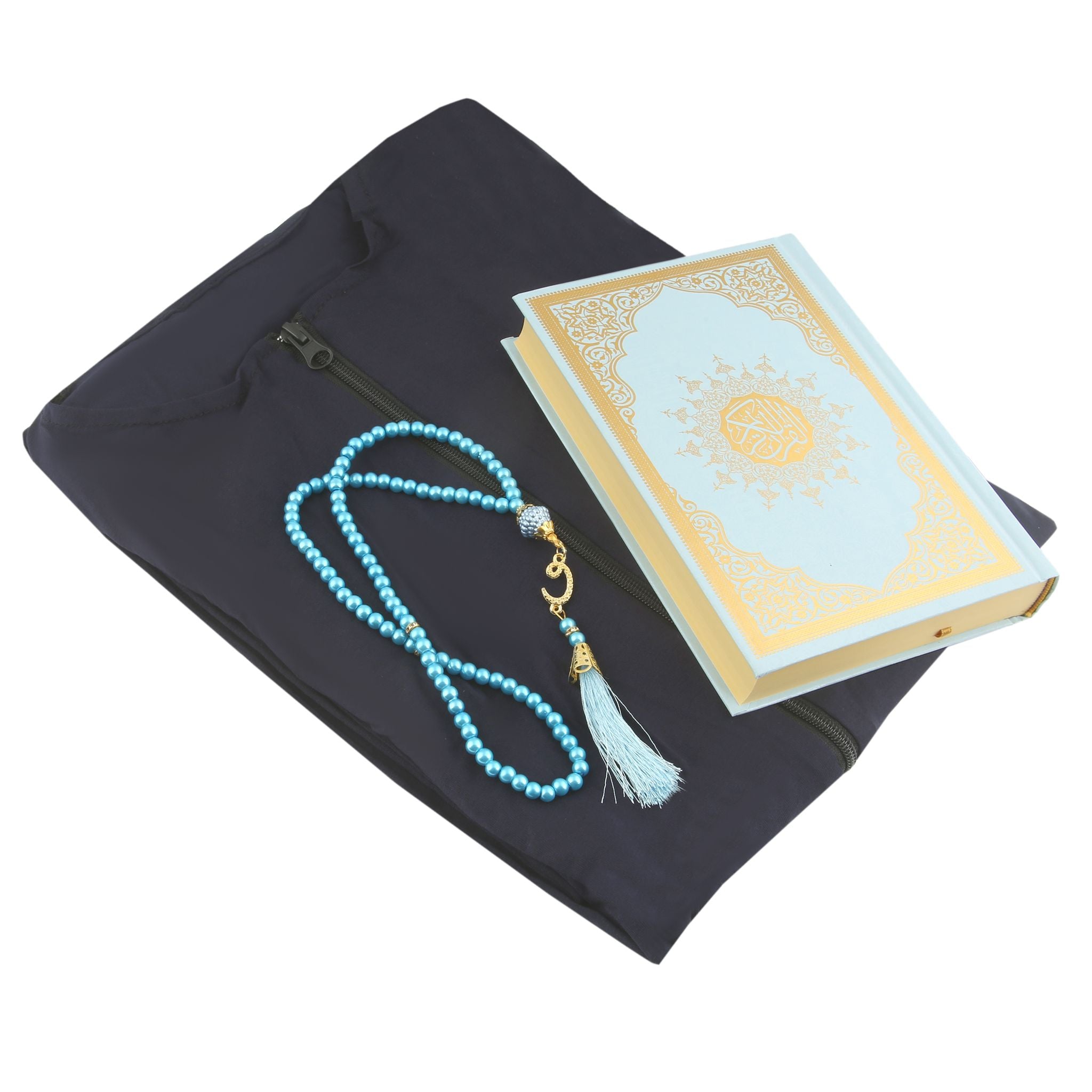 - Asetat kutu içerisinde, 16x20 cm Hafız Boy Ofset Medine Hatlı Kuran-ı Kerim, Fermuarlı Tek Parça Düz Namaz Elbisesi ve 99'luk 6 mm Vavlı İnci Tesbih ile beraber sunulur.