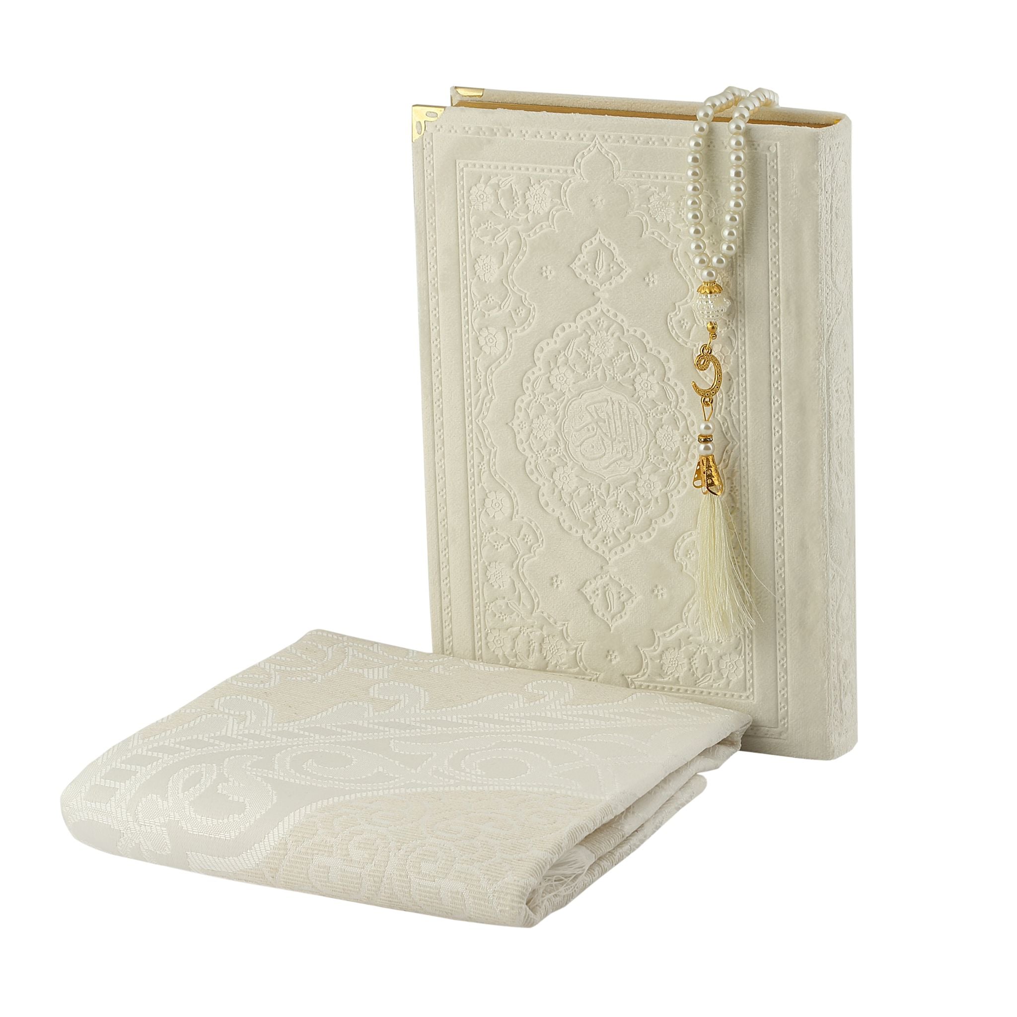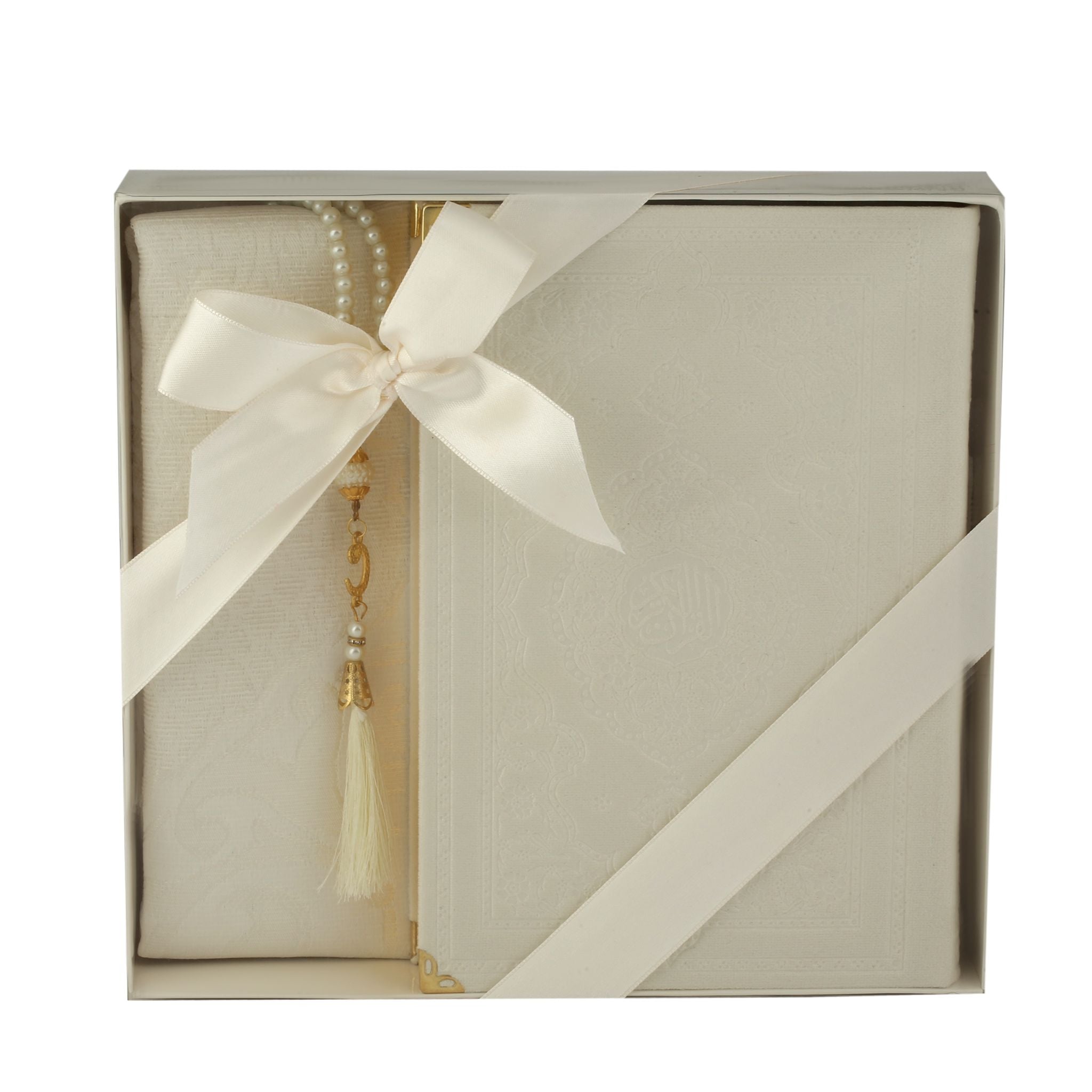 - Asetat kutu içerisinde 99'luk 6 mm Vavlı İnci Tesbih, 70x110 Pamuk Tafta Seccade ve 17x25 Cm Orta Boy Soğuk Baskı Kuran-ı Kerim ile beraber sunulur.