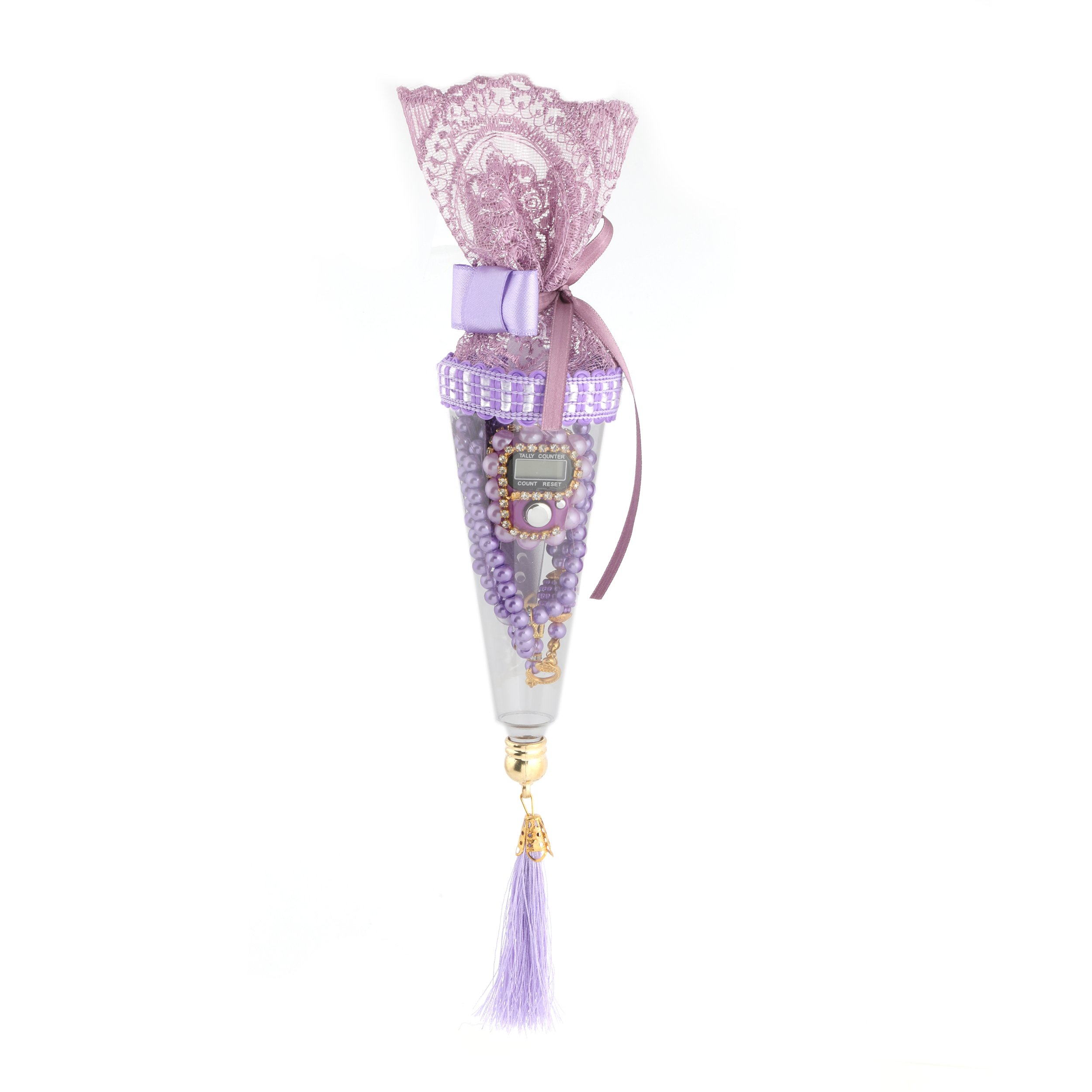 - Şeffaf huni içerisinde Taşlı Zikirmatik ve 99'luk 6 mm Vavlı İnci Tesbih ile beraber sunulur.