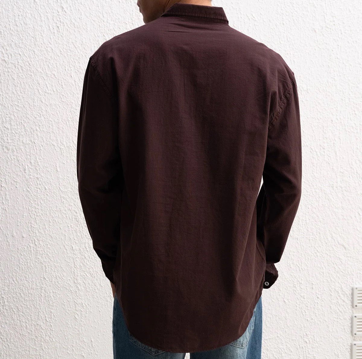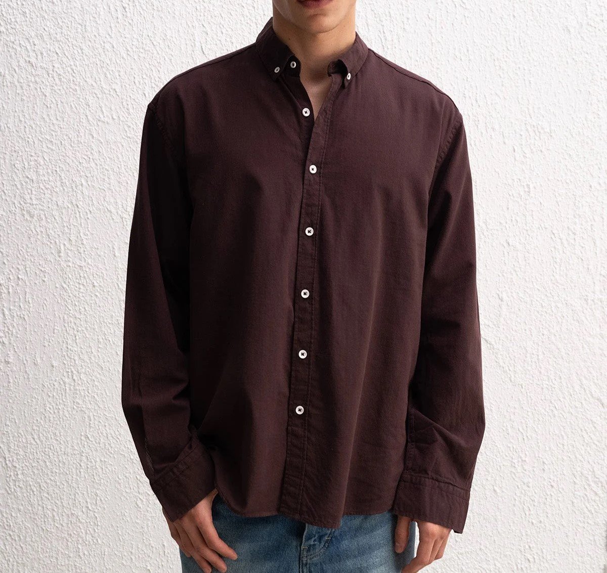 Rahat kesim, uzun kollu, oversize dökümlü gömlek.